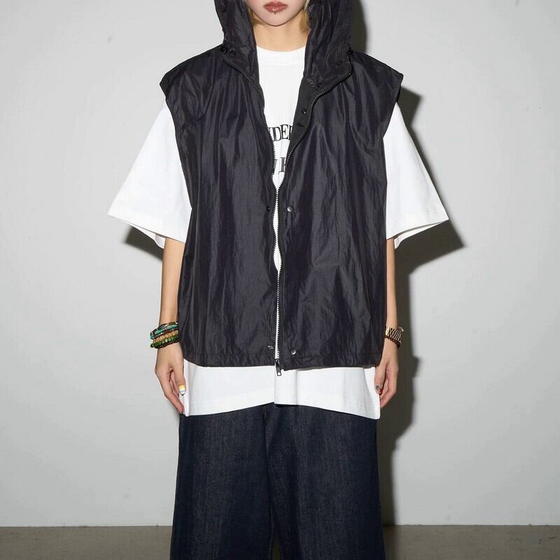 フード付きジップアップベストは、ドロップショルダーとオーバーサイズのシルエットが一枚でこなれた雰囲気を演出します。