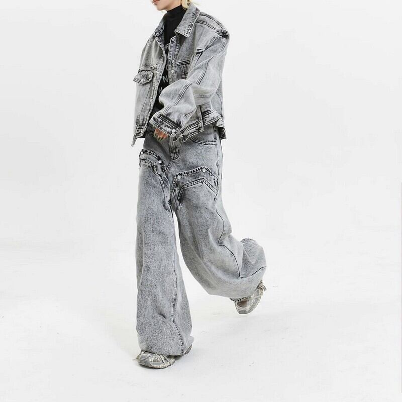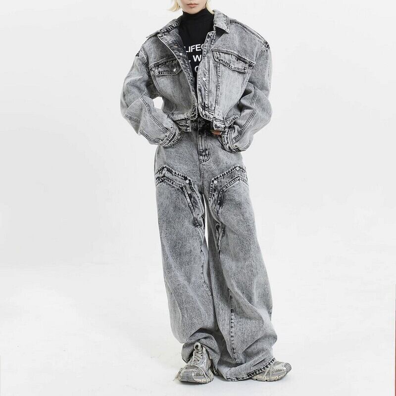 存在感のあるワイドレッグデニムパンツのセットアイテムです。