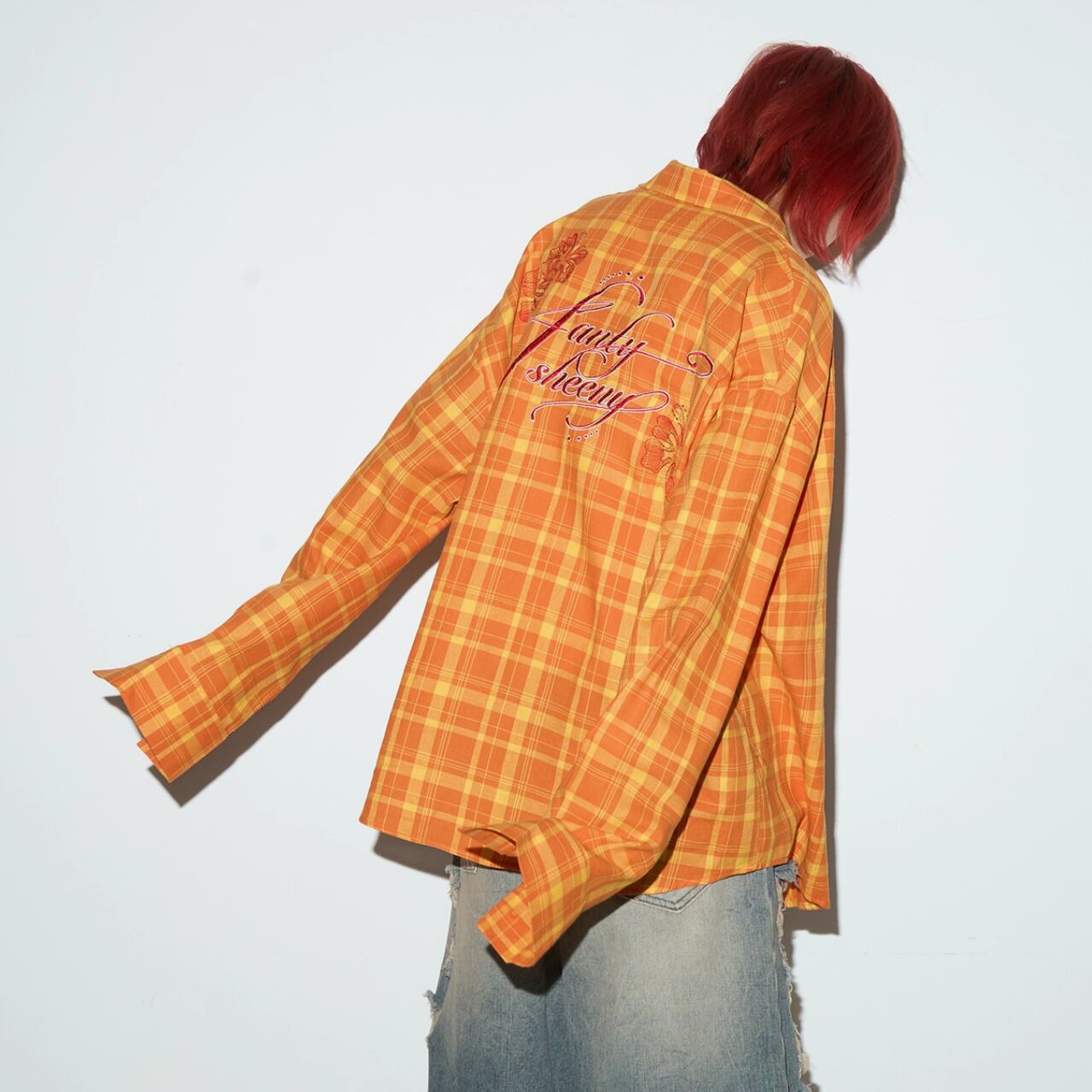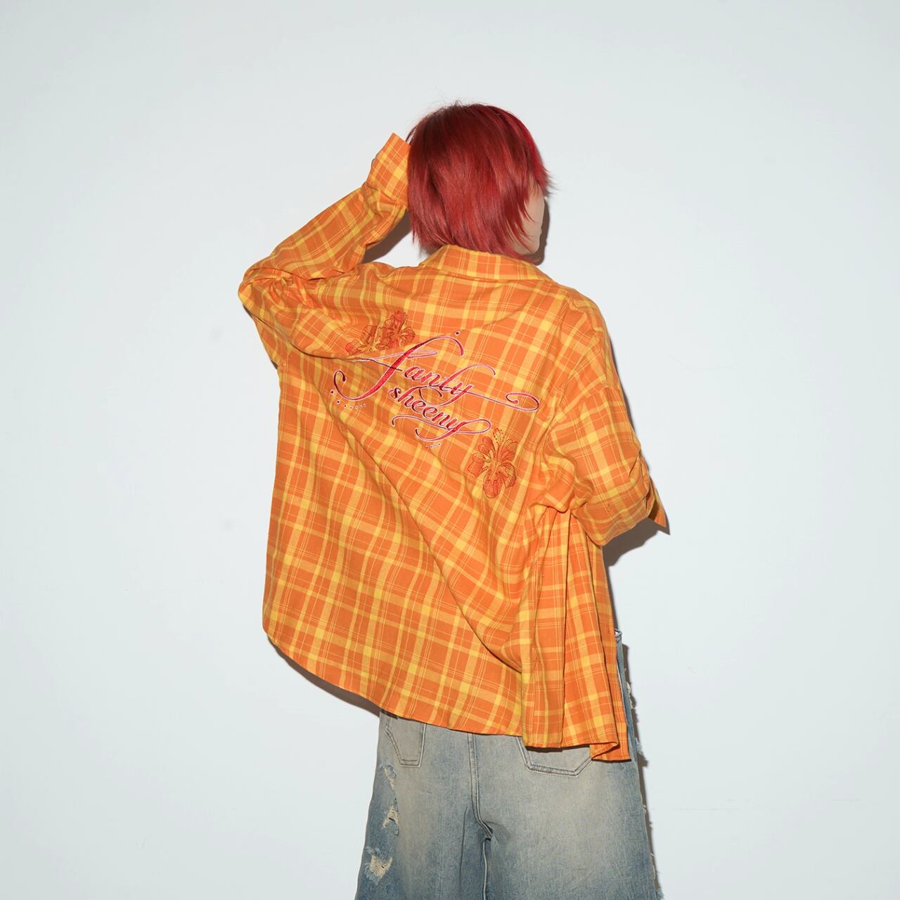オレンジとイエローの鮮やかなチェック柄が、コーディネートのアクセントになります。