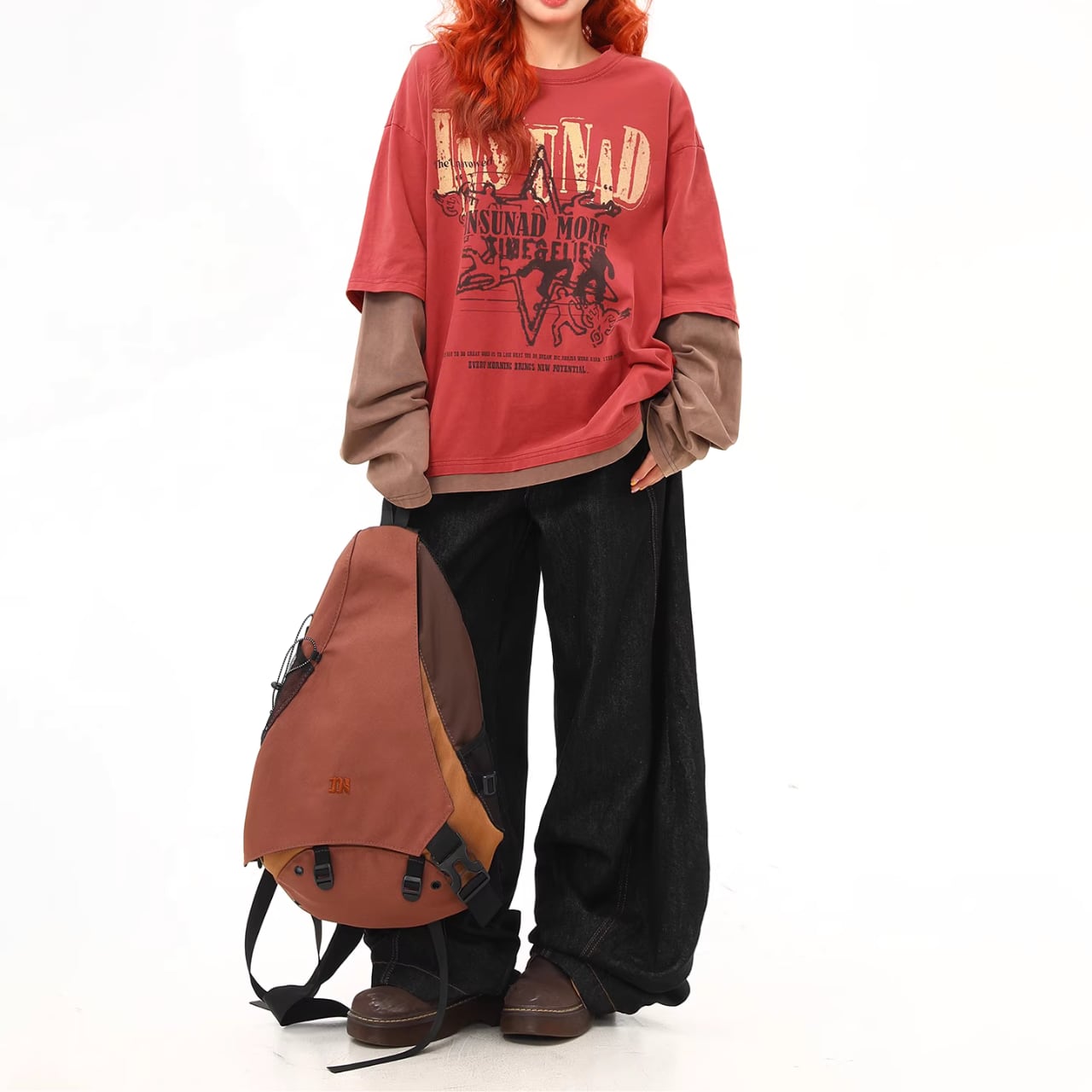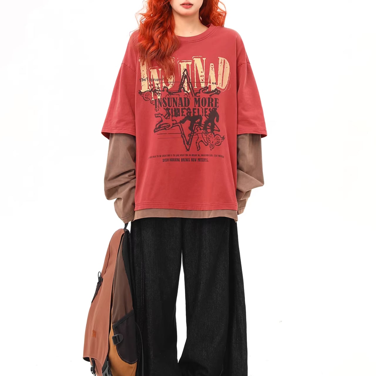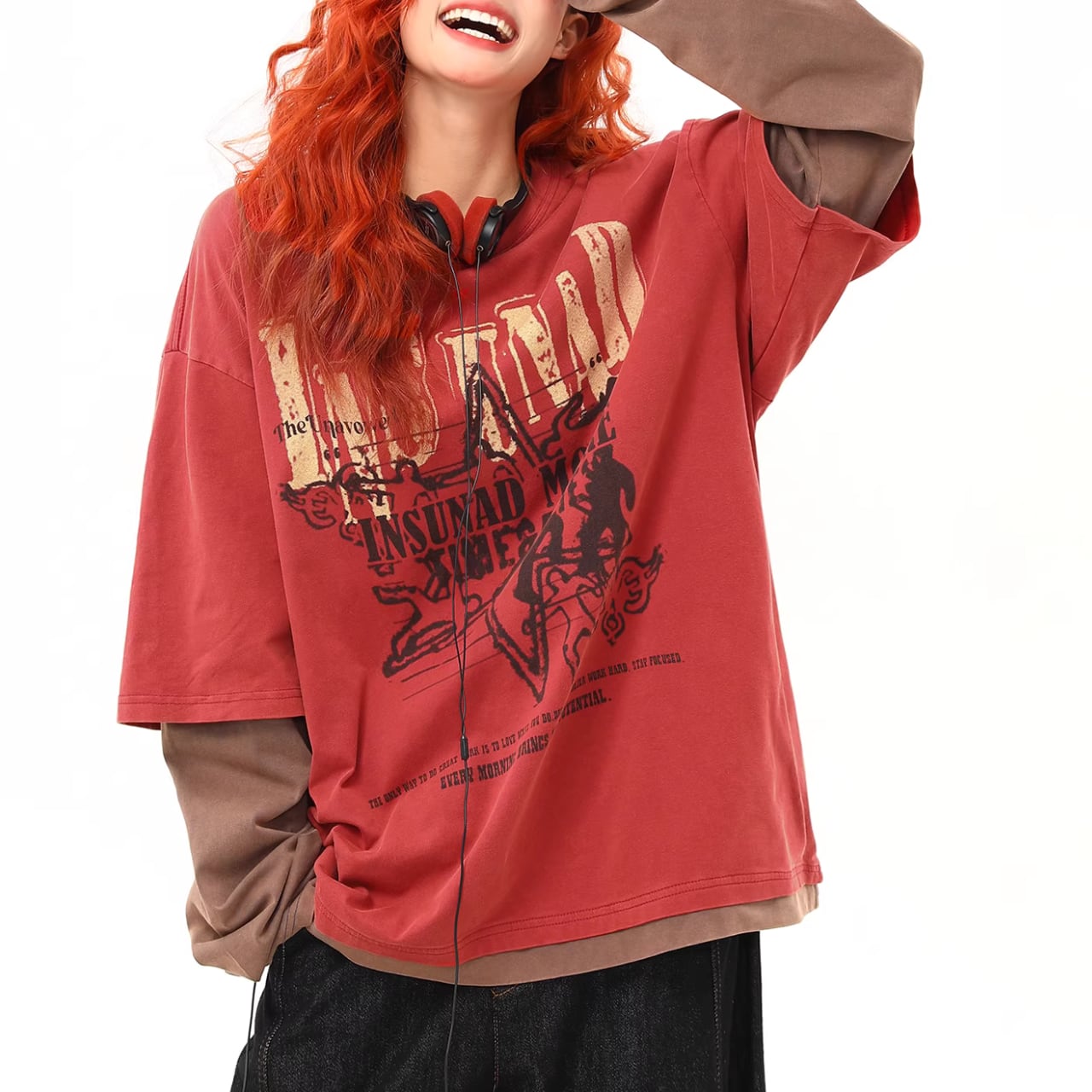 レイヤード風デザインが魅力のオーバーサイズクルーネック長袖Tシャツです。