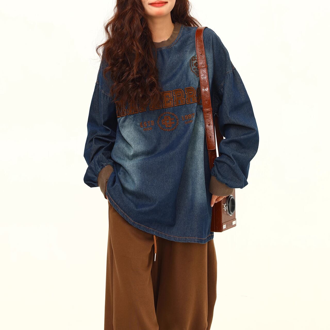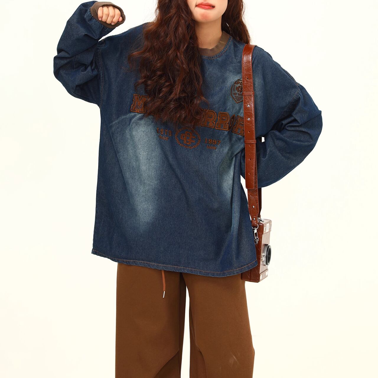 デニム刺繍ロゴバルーンスリーブトップスB0358