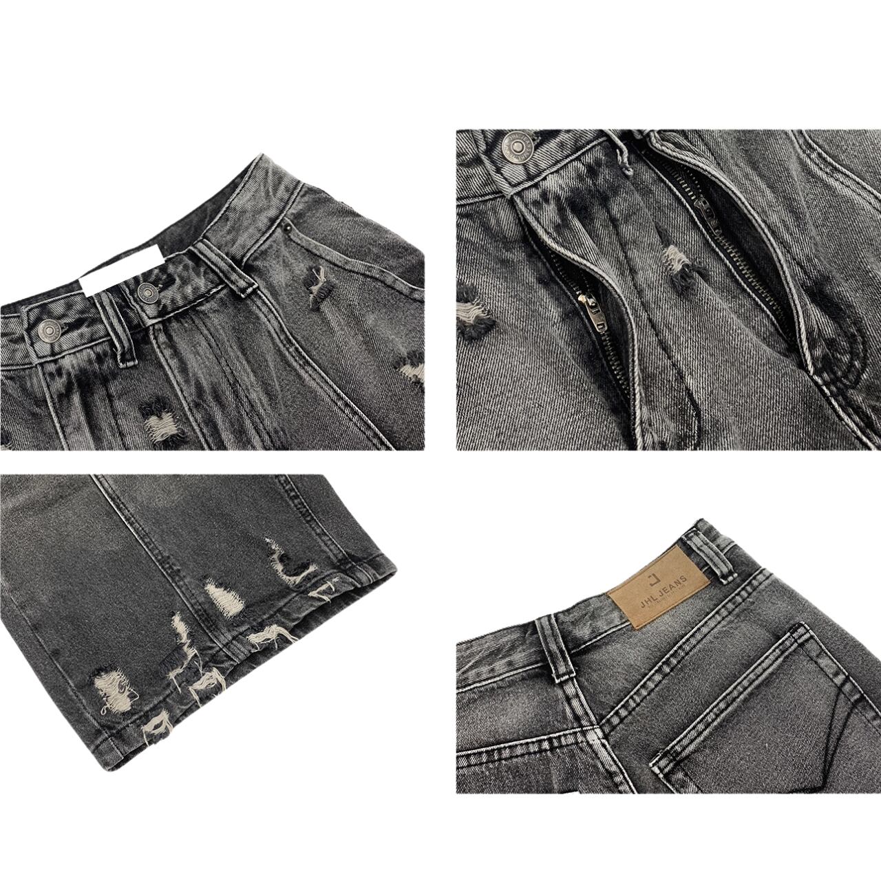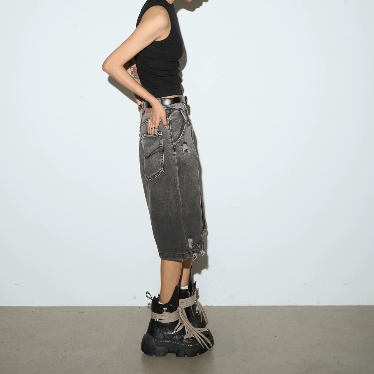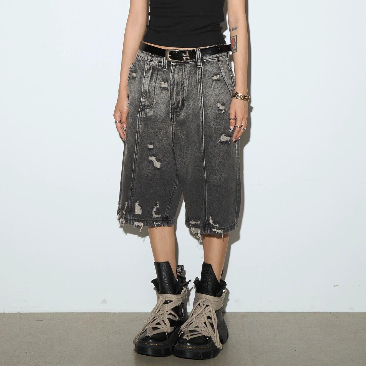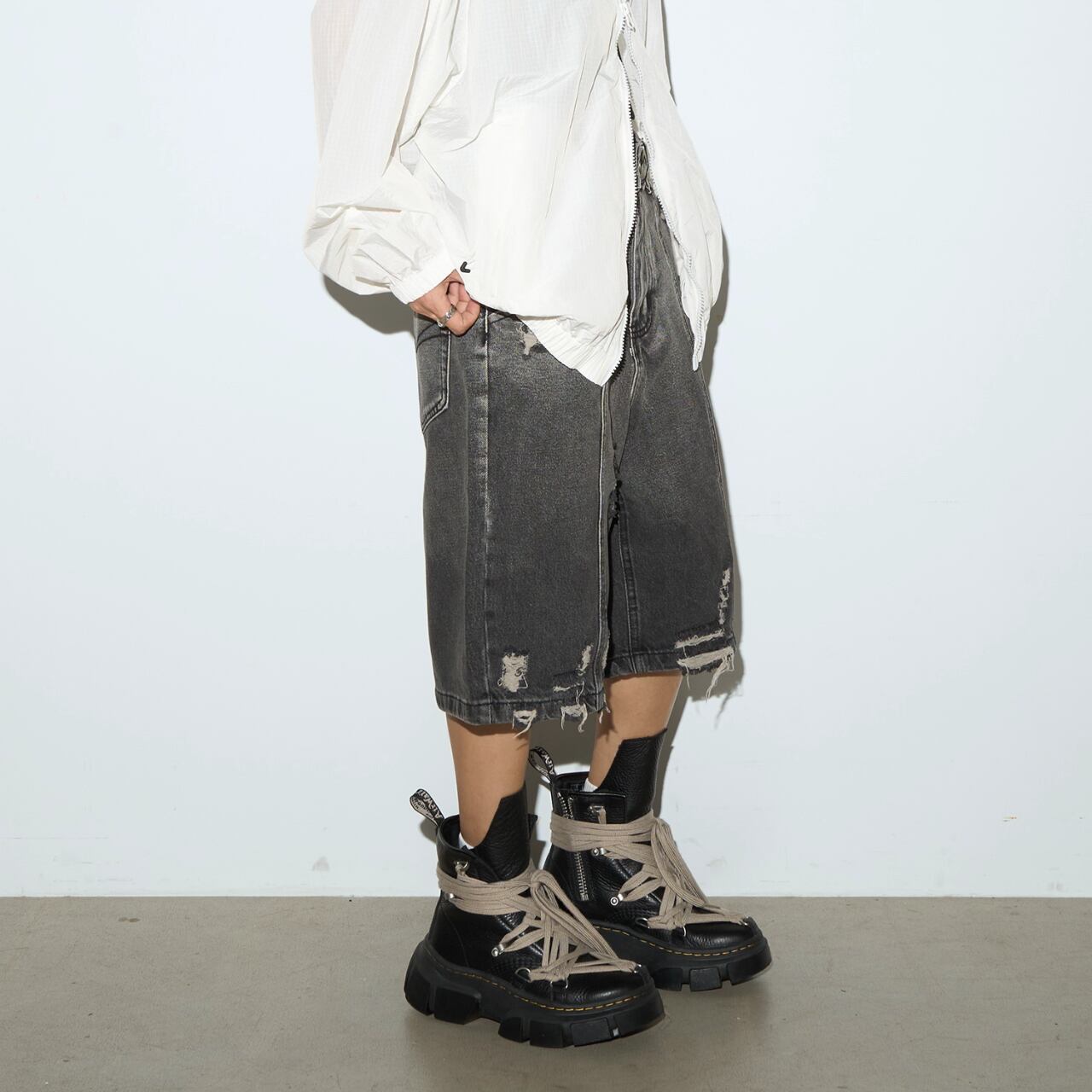 個性的なダメージ加工とセンターシームが特徴的なショートパンツ。