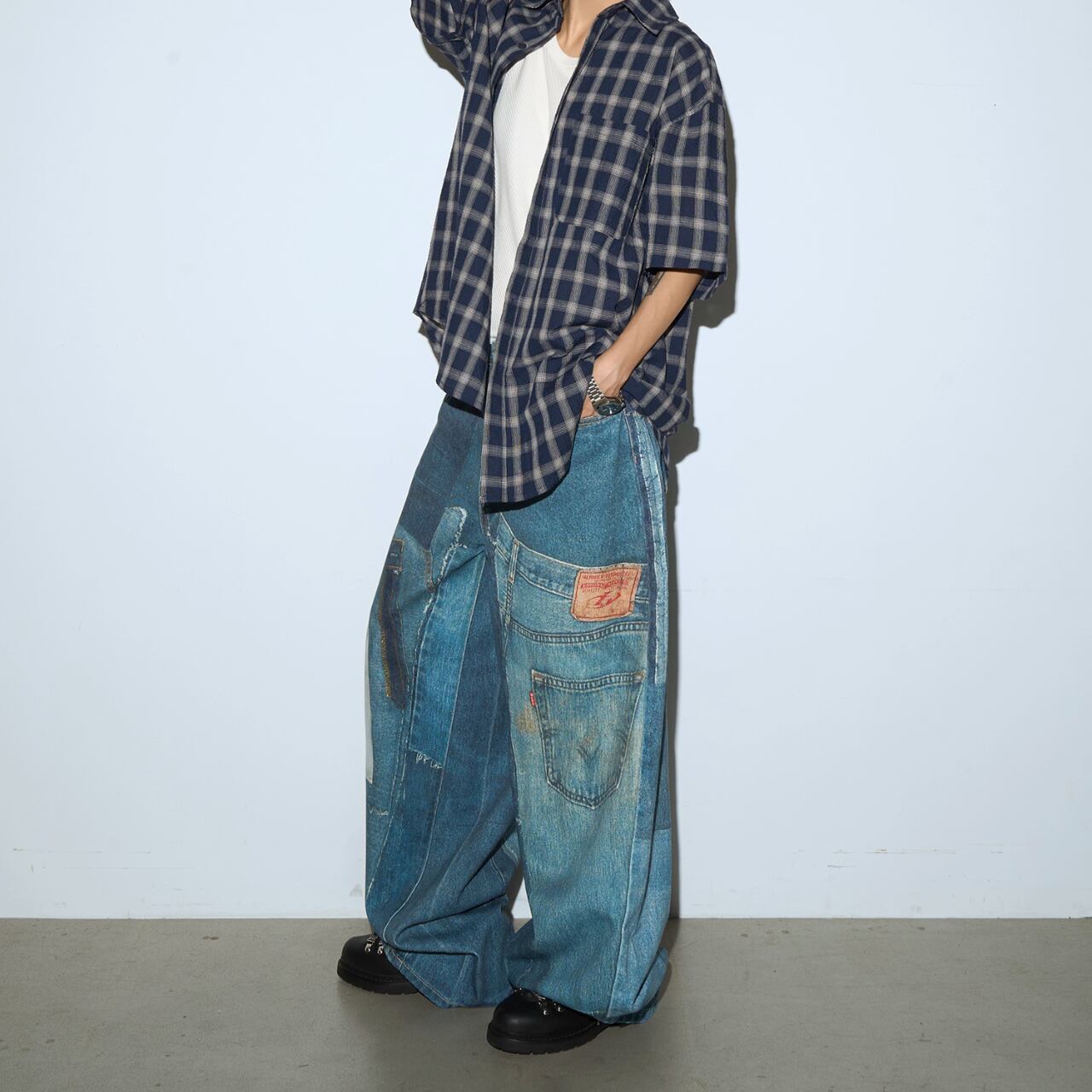 個性的なパッチワークと切りっぱなしのワイドレッグシルエットが魅力のデニムパンツ。