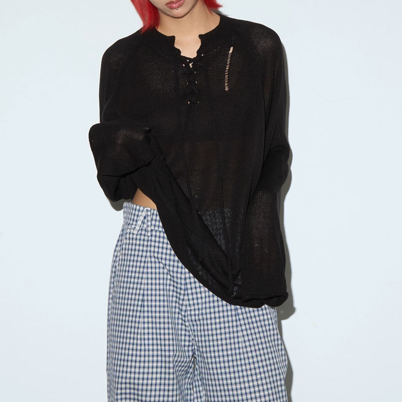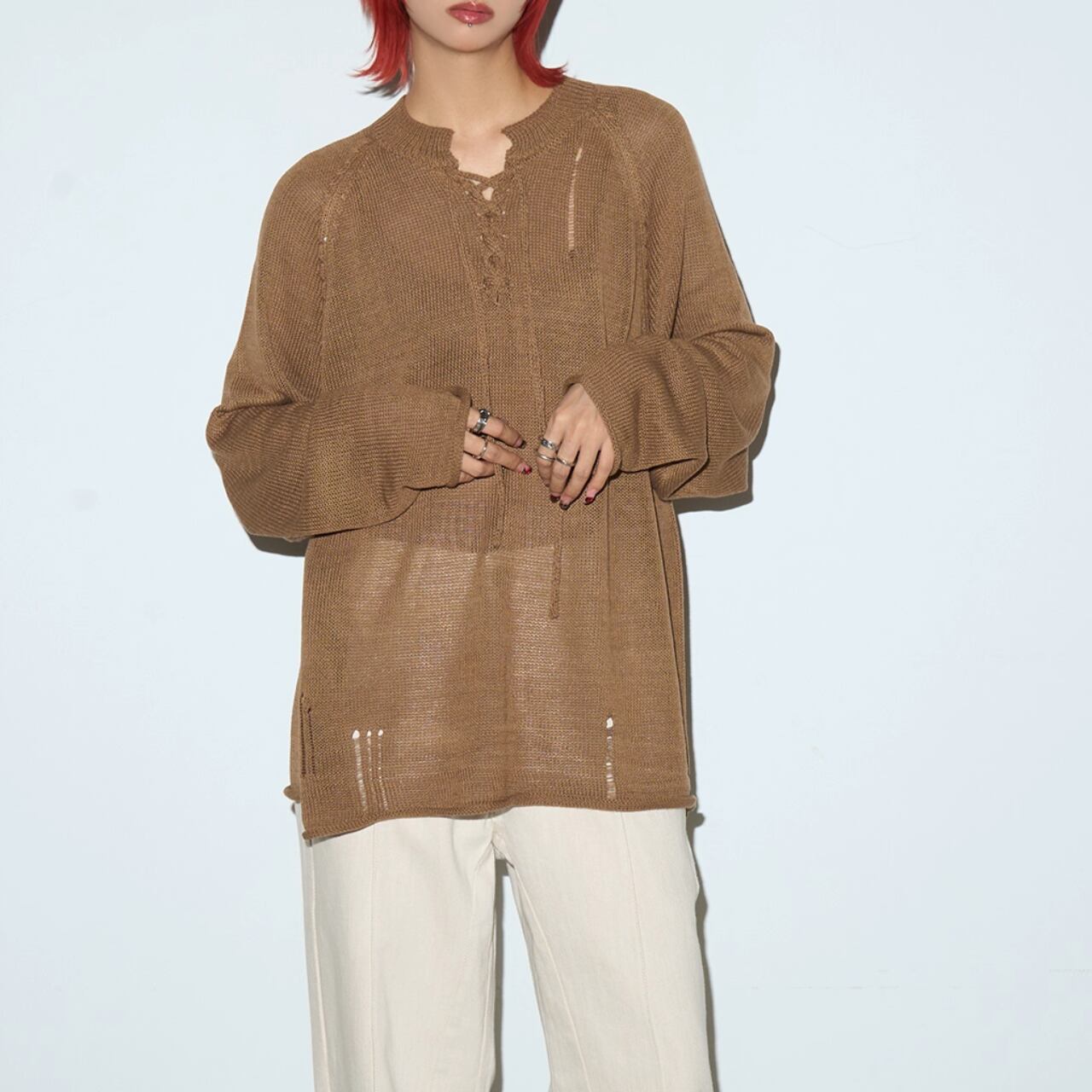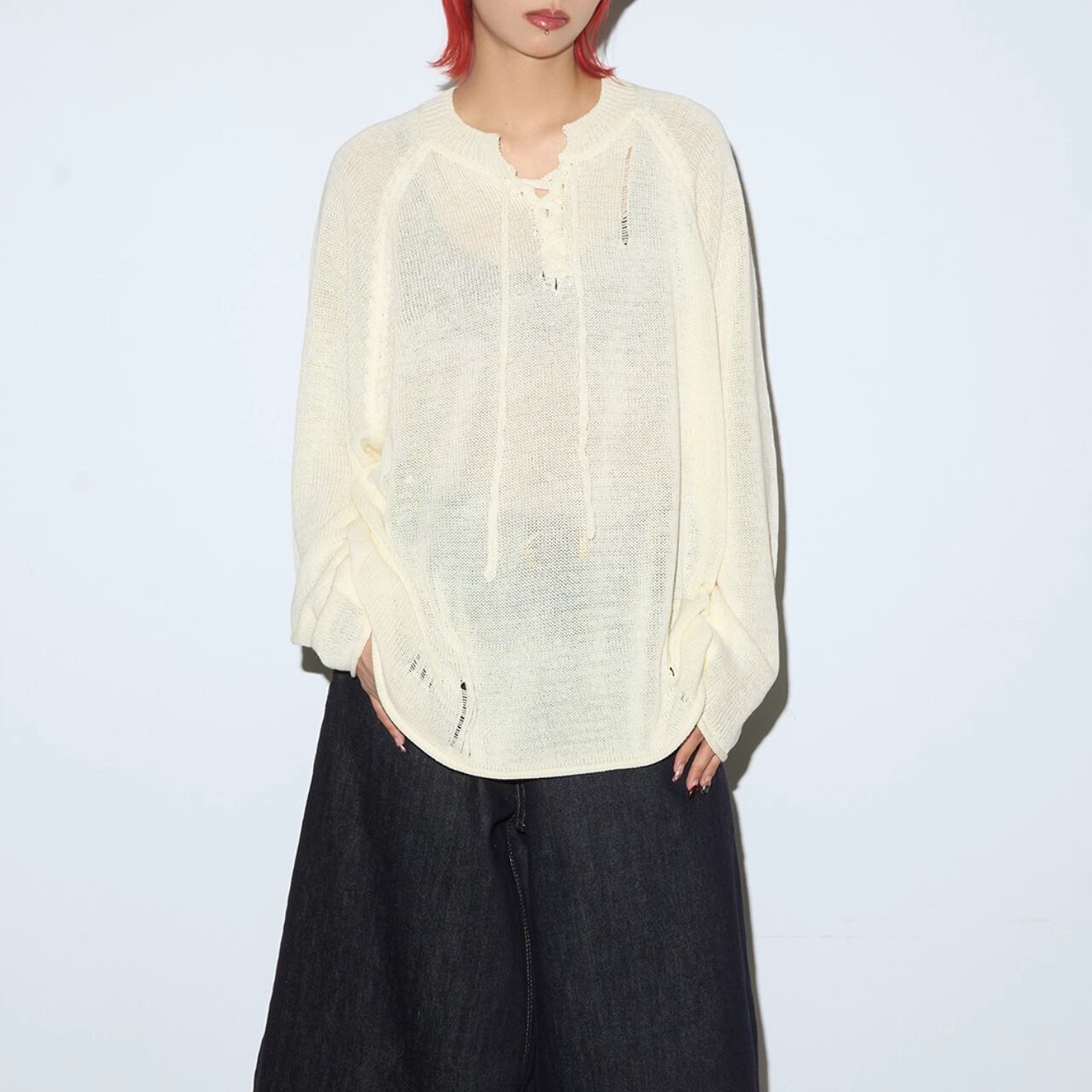 ネック部分の編み上げデザインが目を惹くニットプルオーバー。
