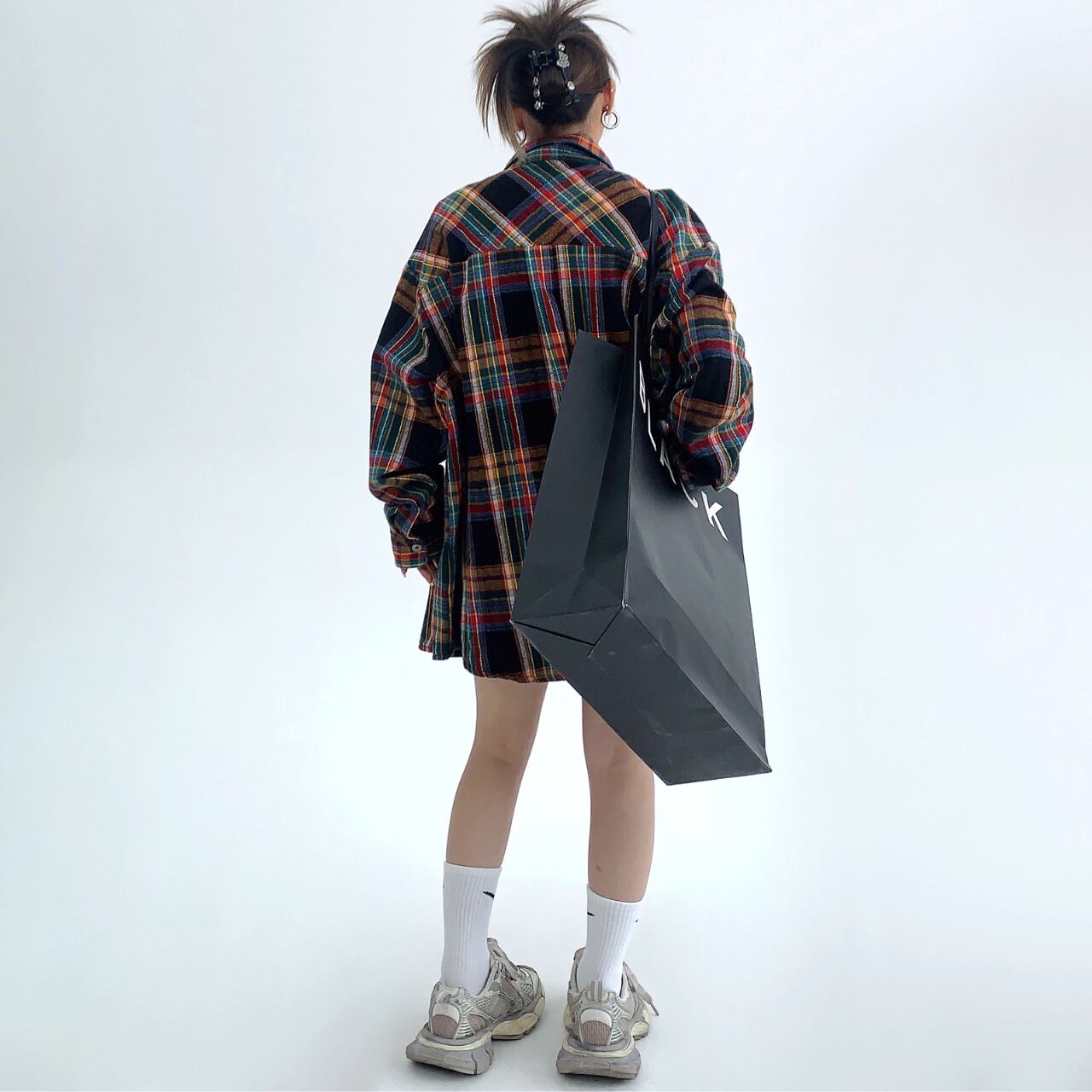 ルーズ刺繍チェックシャツ【M/L/XL/2XL】B0405