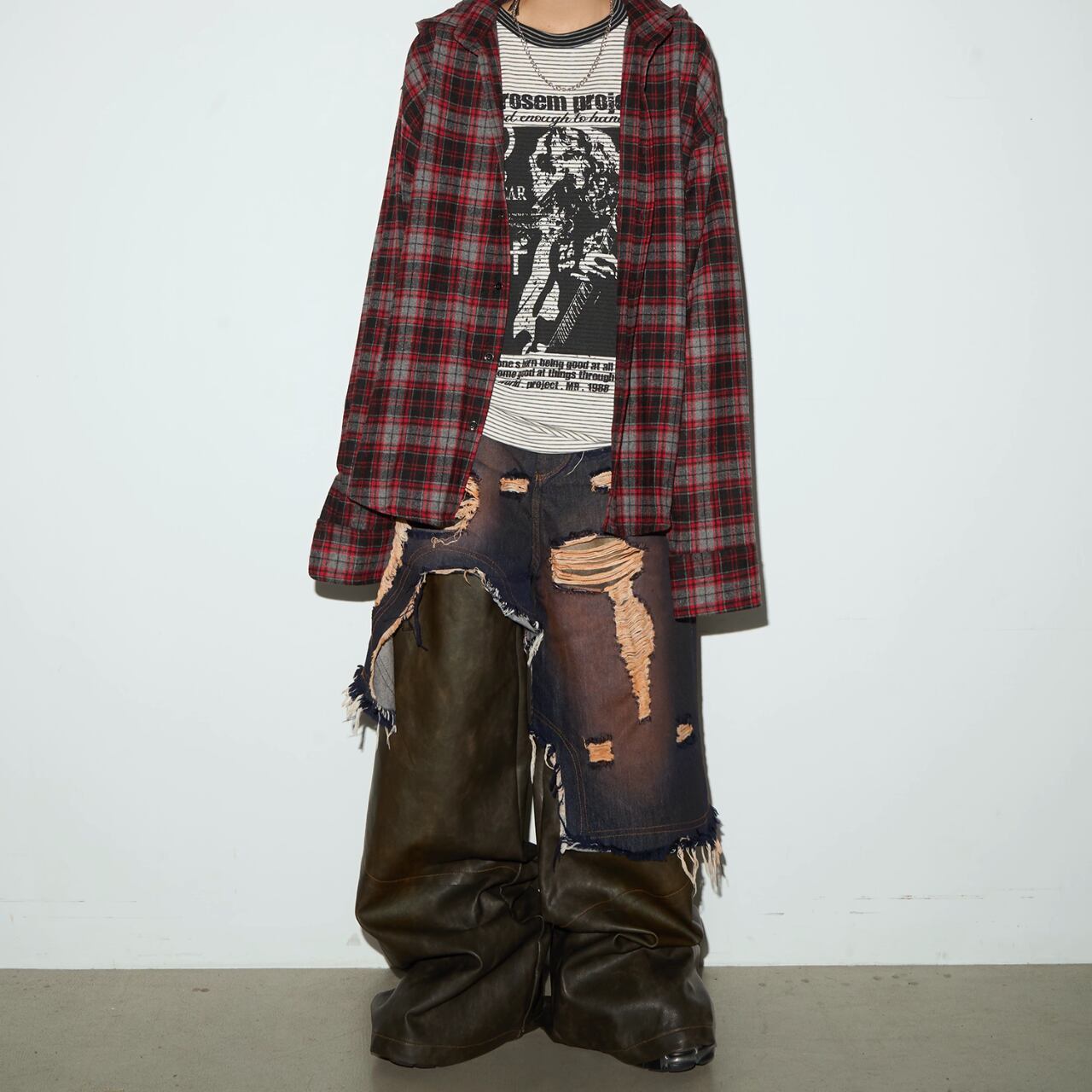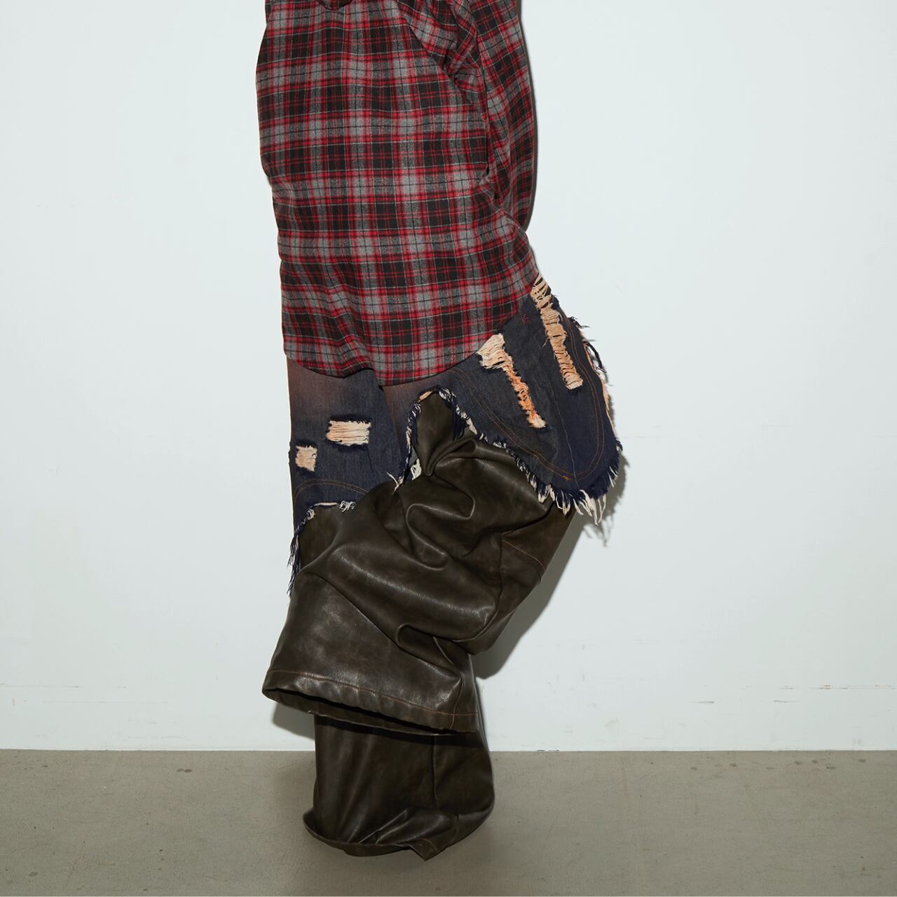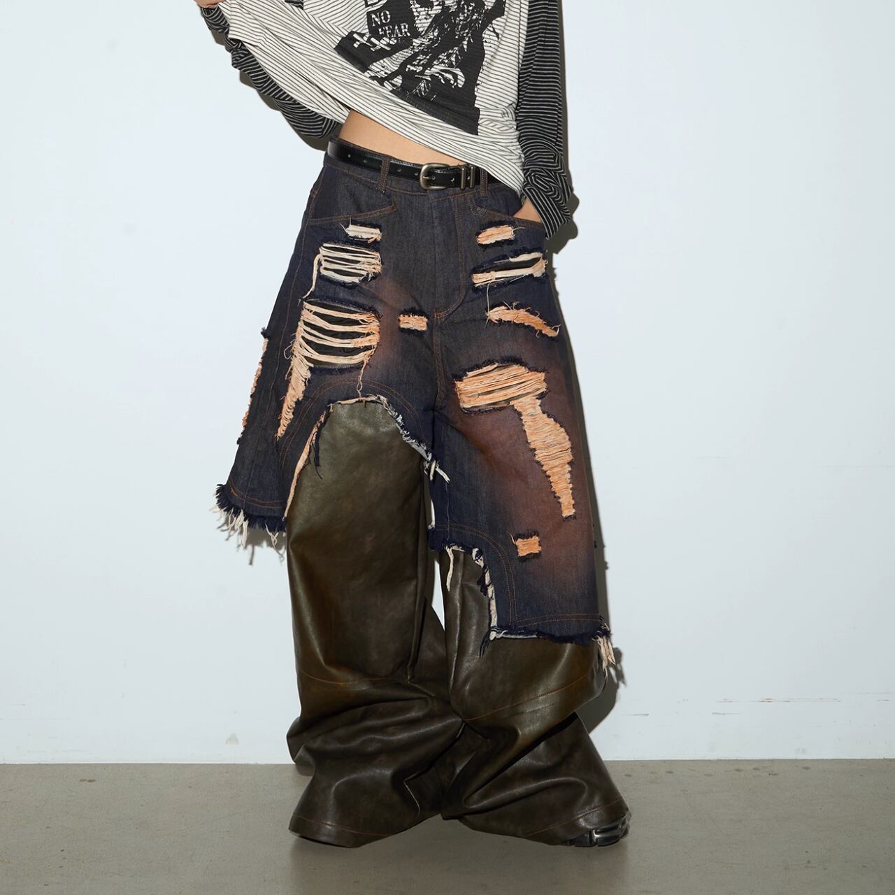 デニムとPUレザーの異素材の組み合わせで、