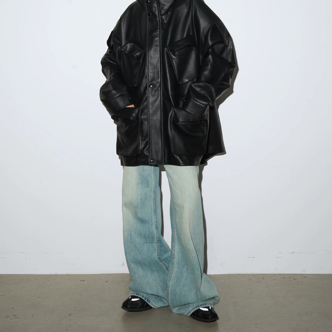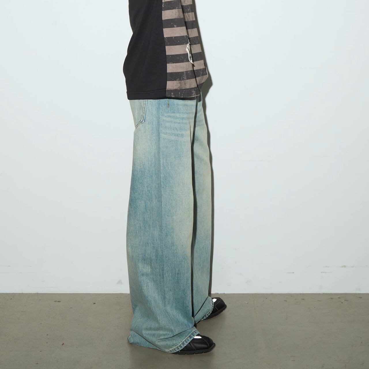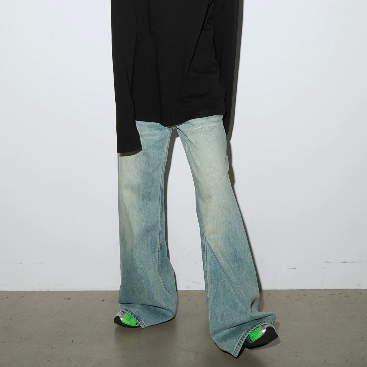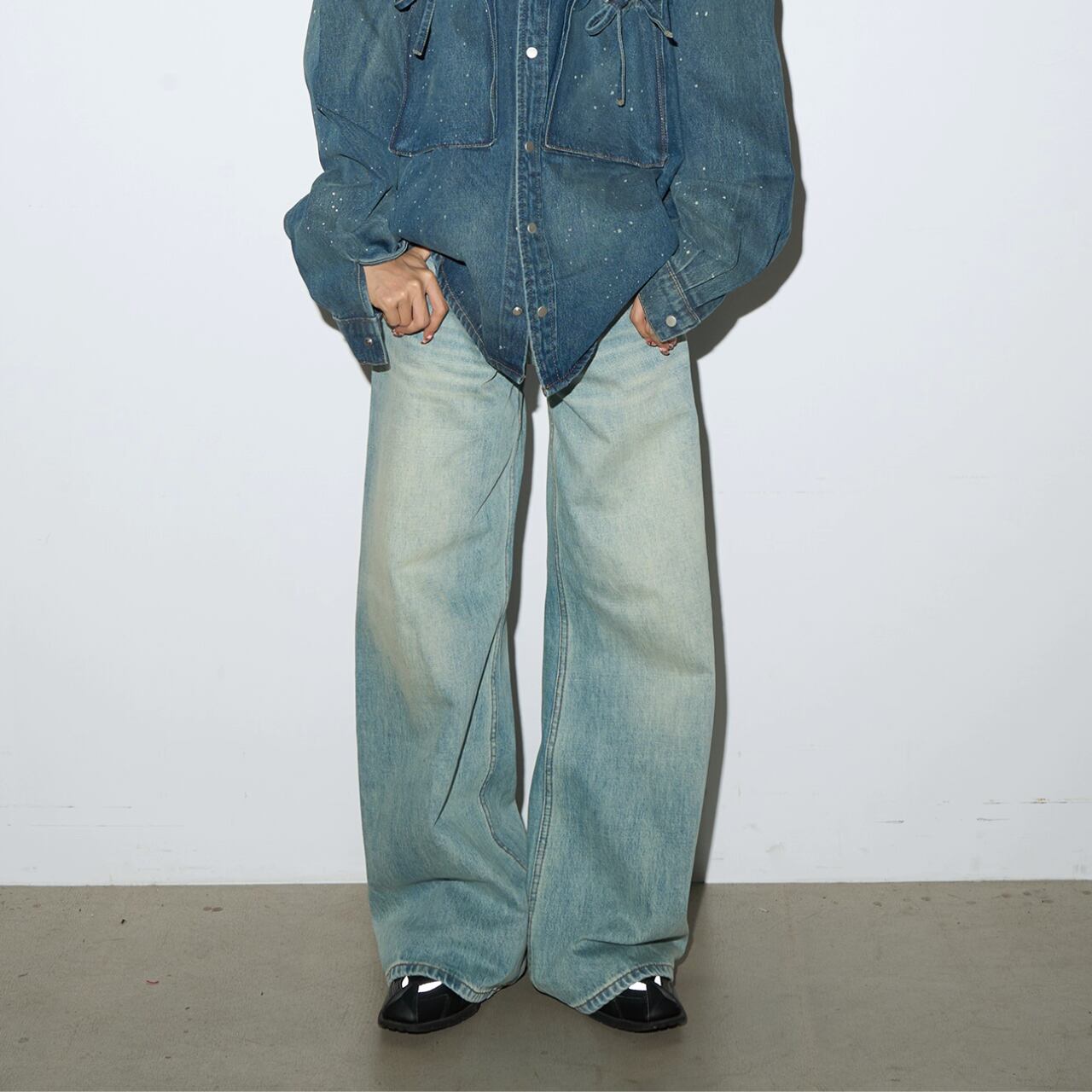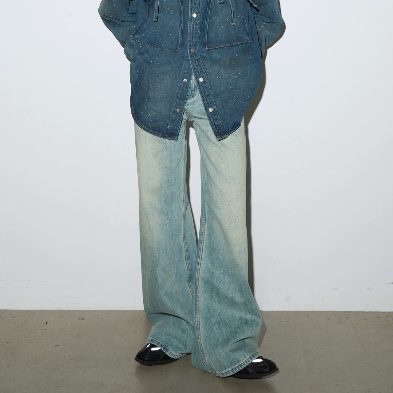 トレンドのベルボトムシルエットが魅力的なワイドレッグデニムパンツ。