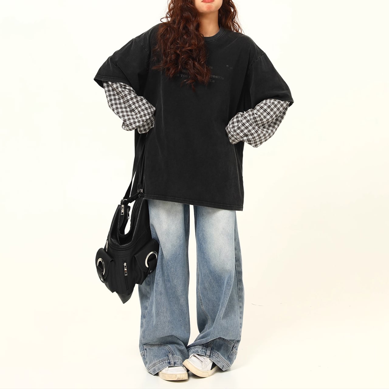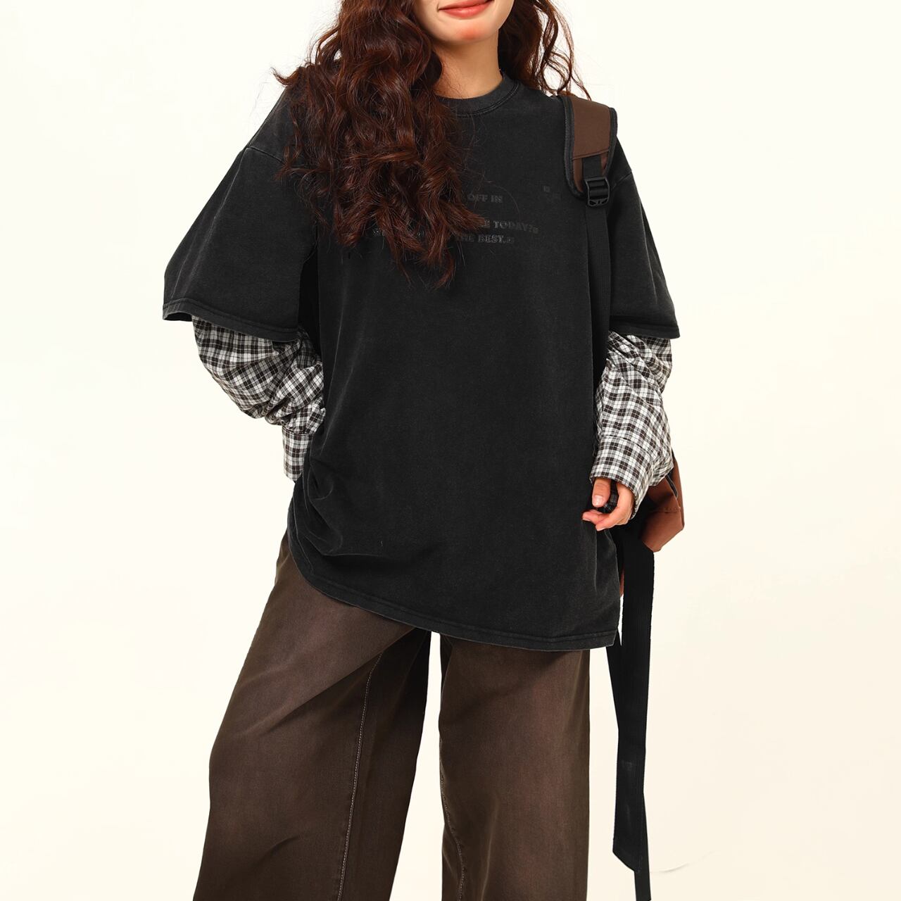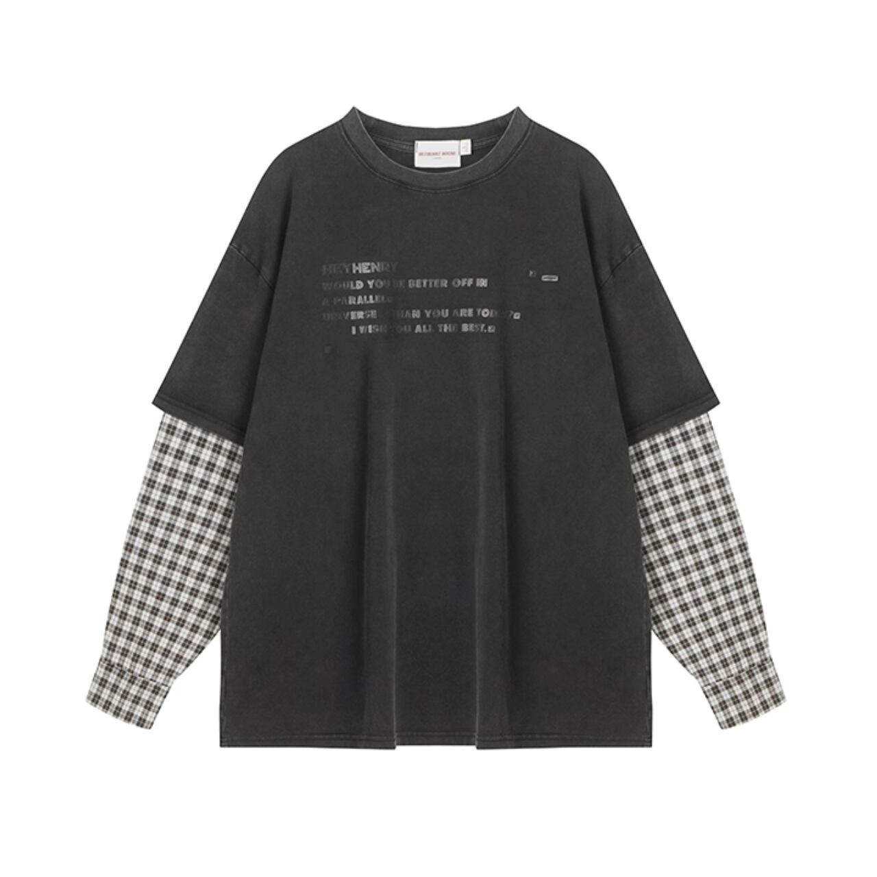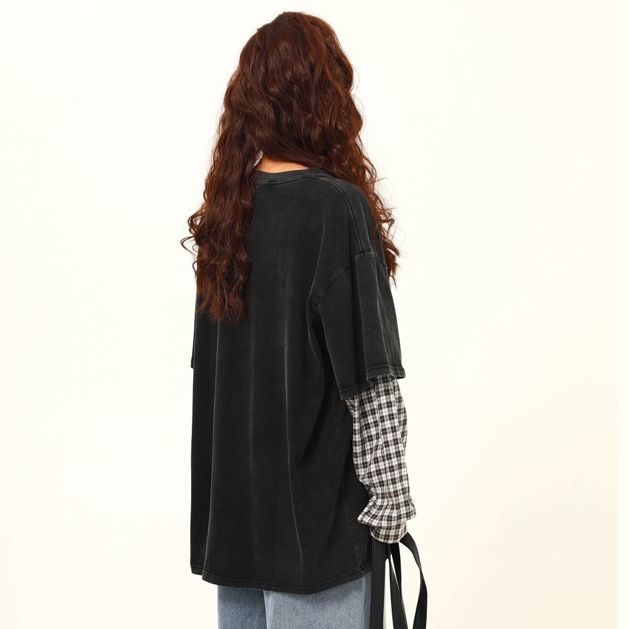 レイヤード風 オーバーサイズTシャツ × チェックシャツスリーブ【M/L/XL】B0427
