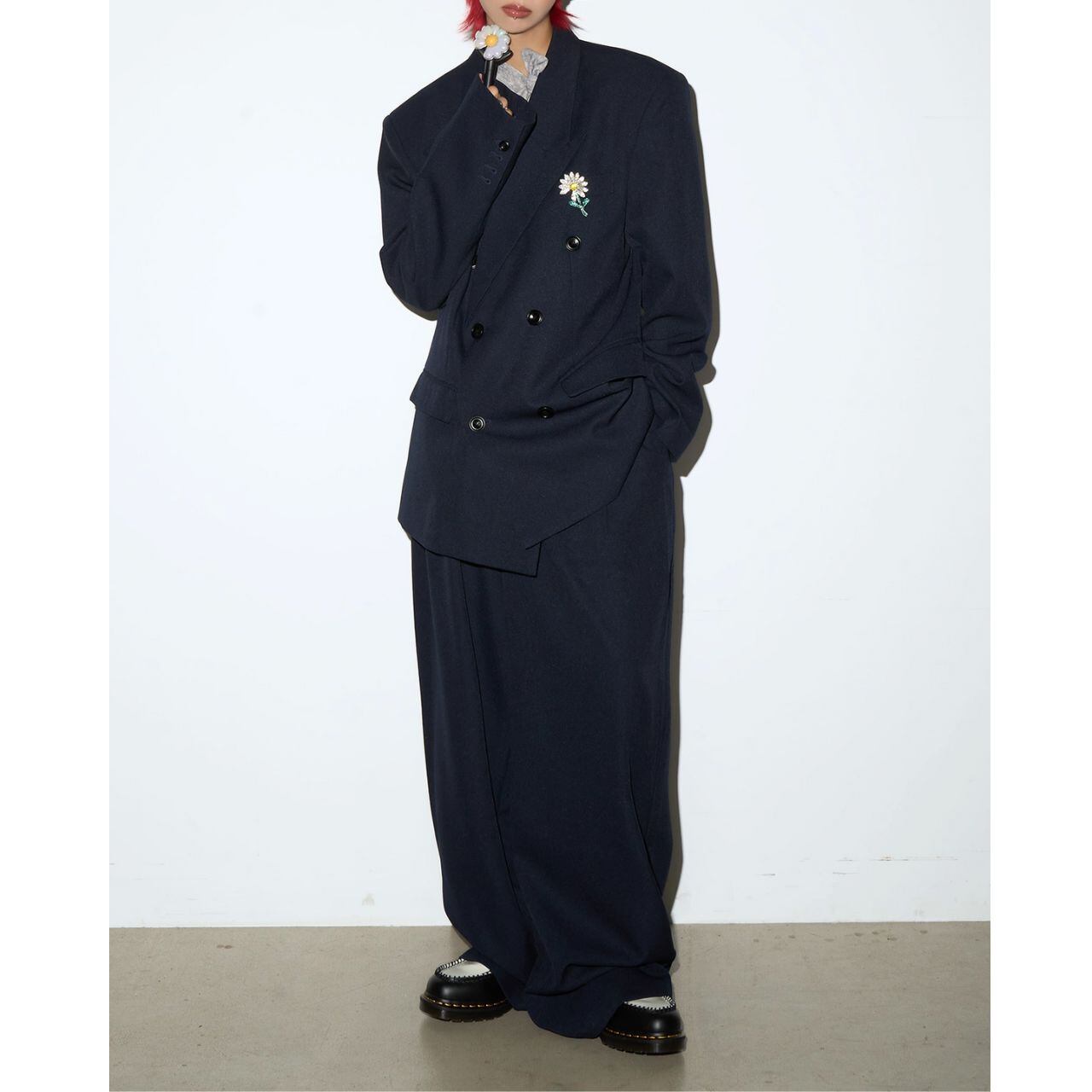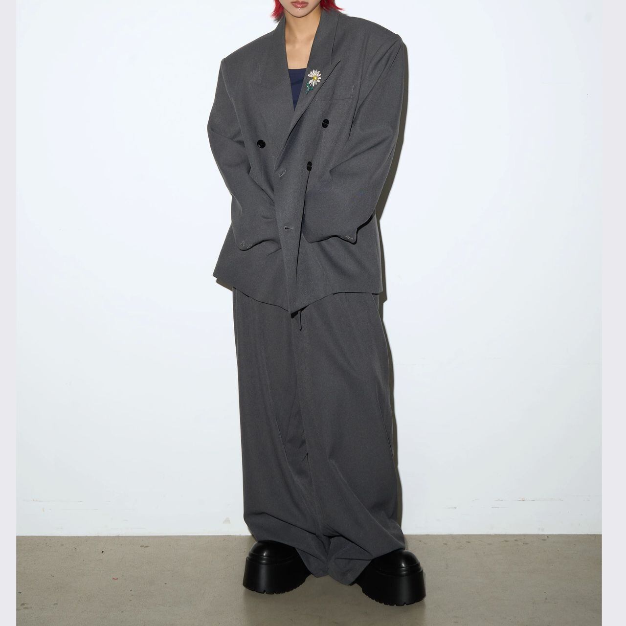 ノッチドラペルダブルボタンジャケット&ワイドパンツのセットアップ。