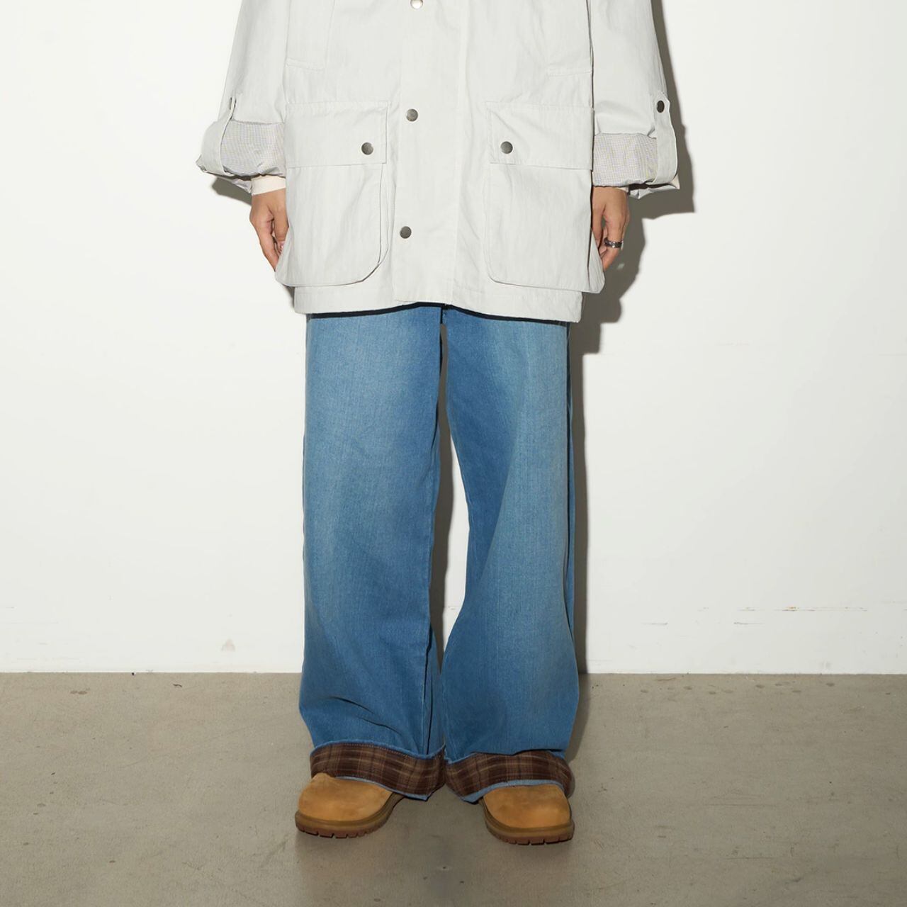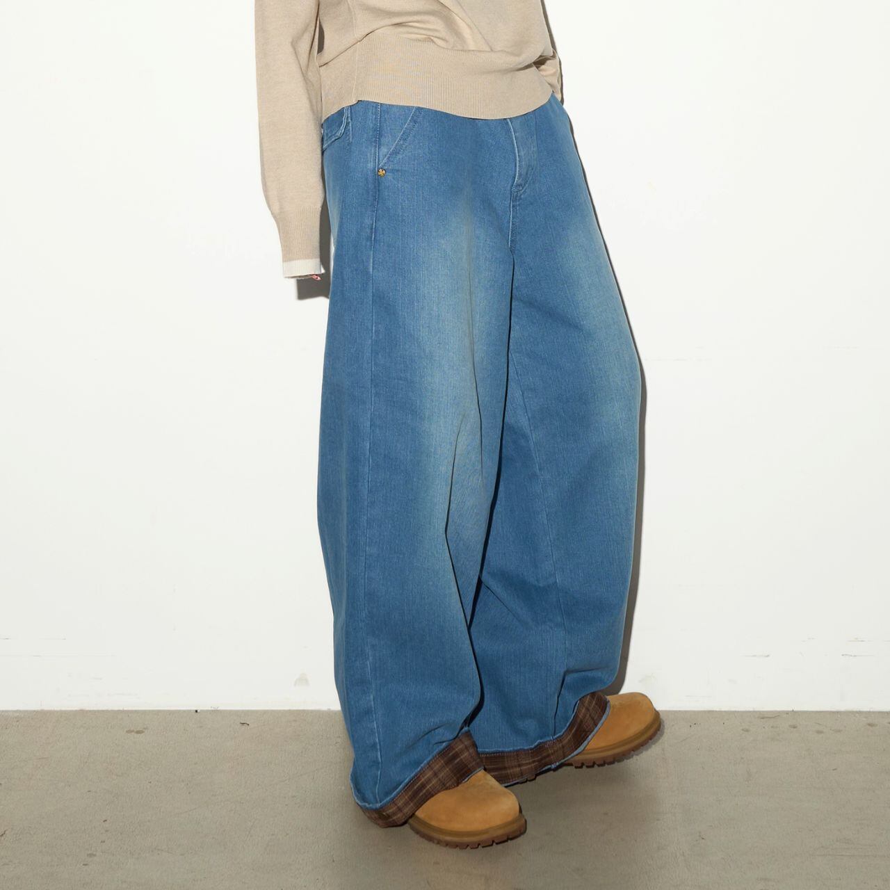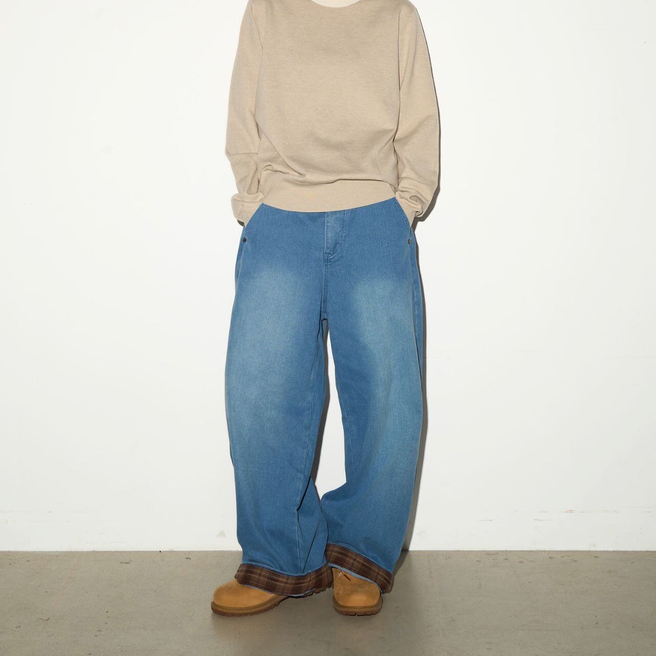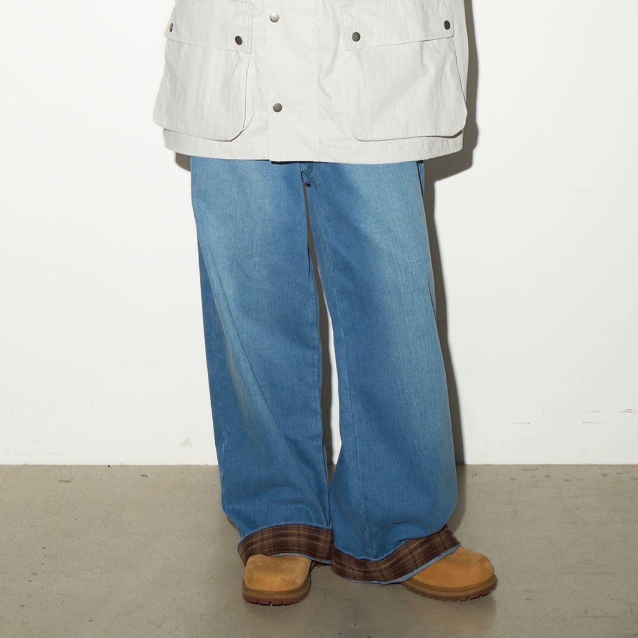 裾から覗くチェック柄がアクセントになったワイドシルエットのデニムパンツ。