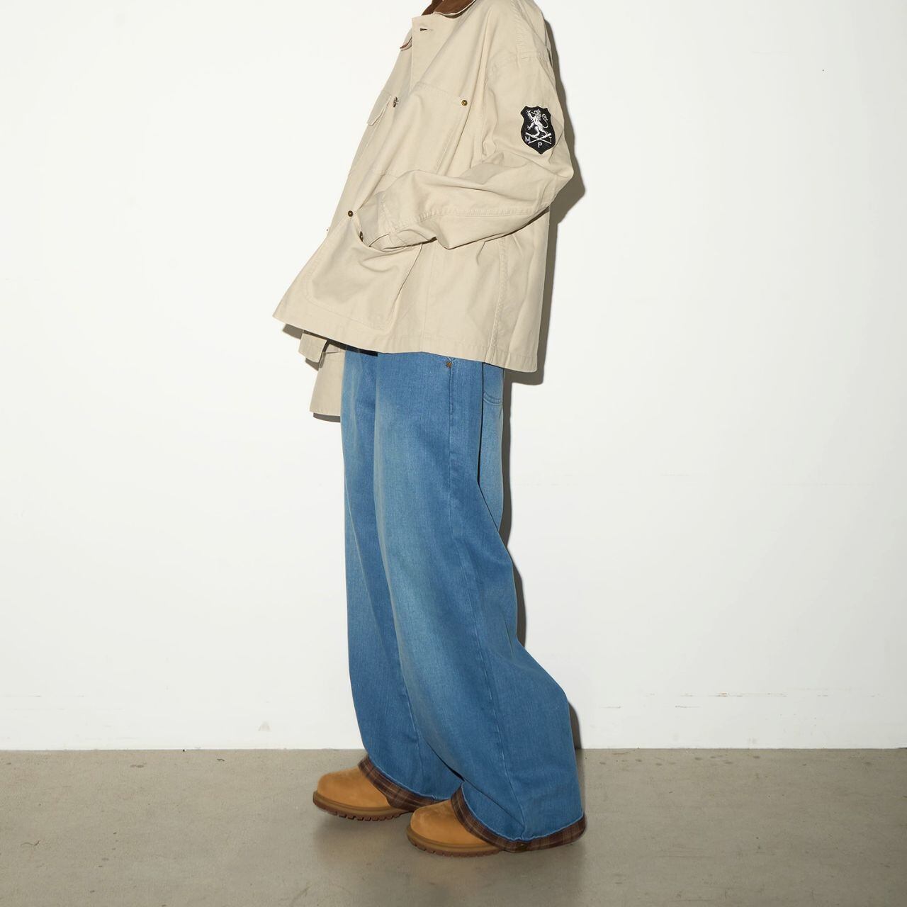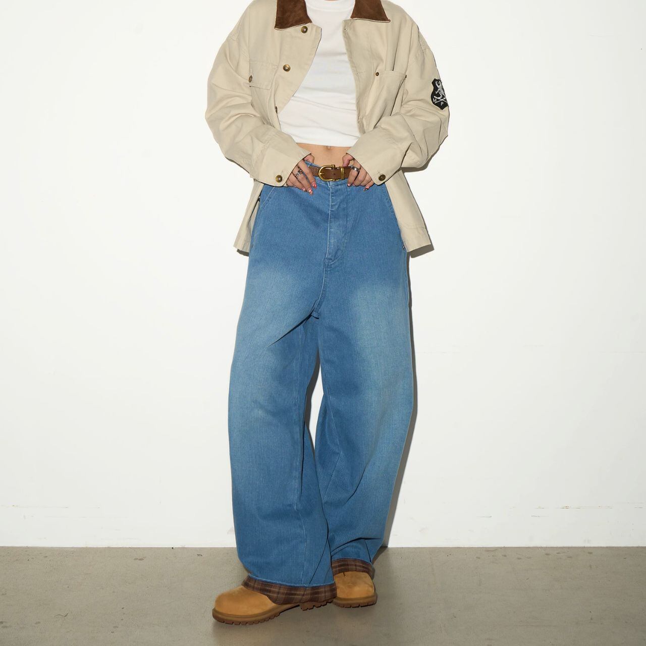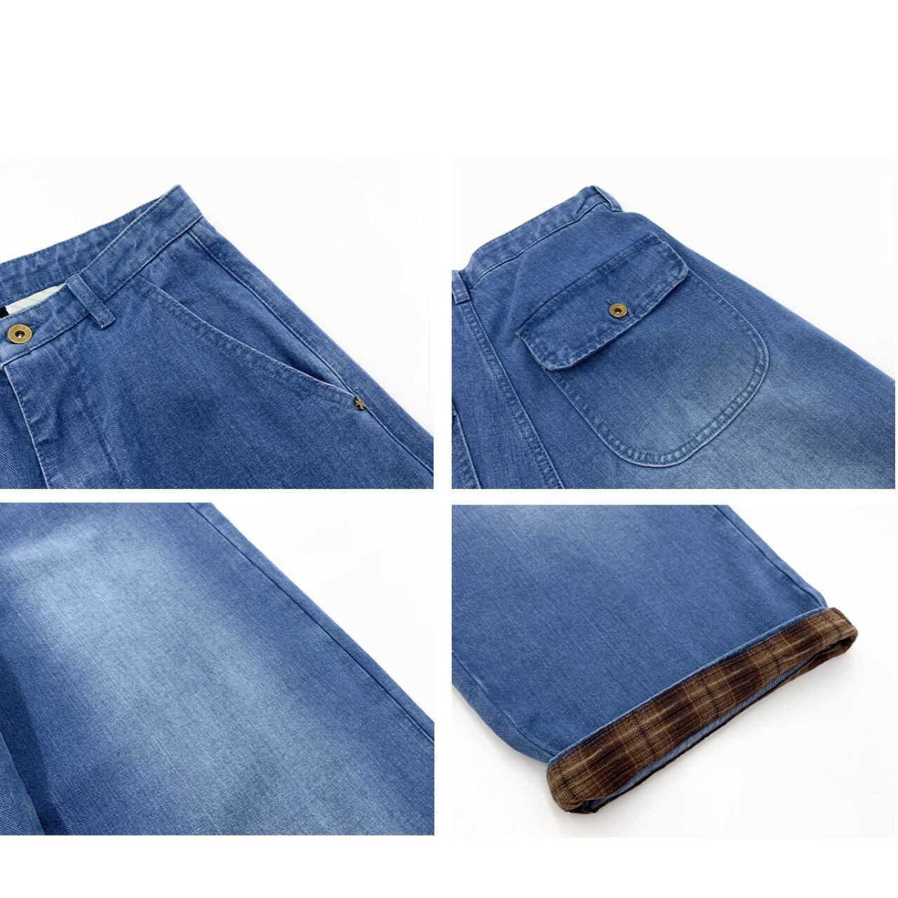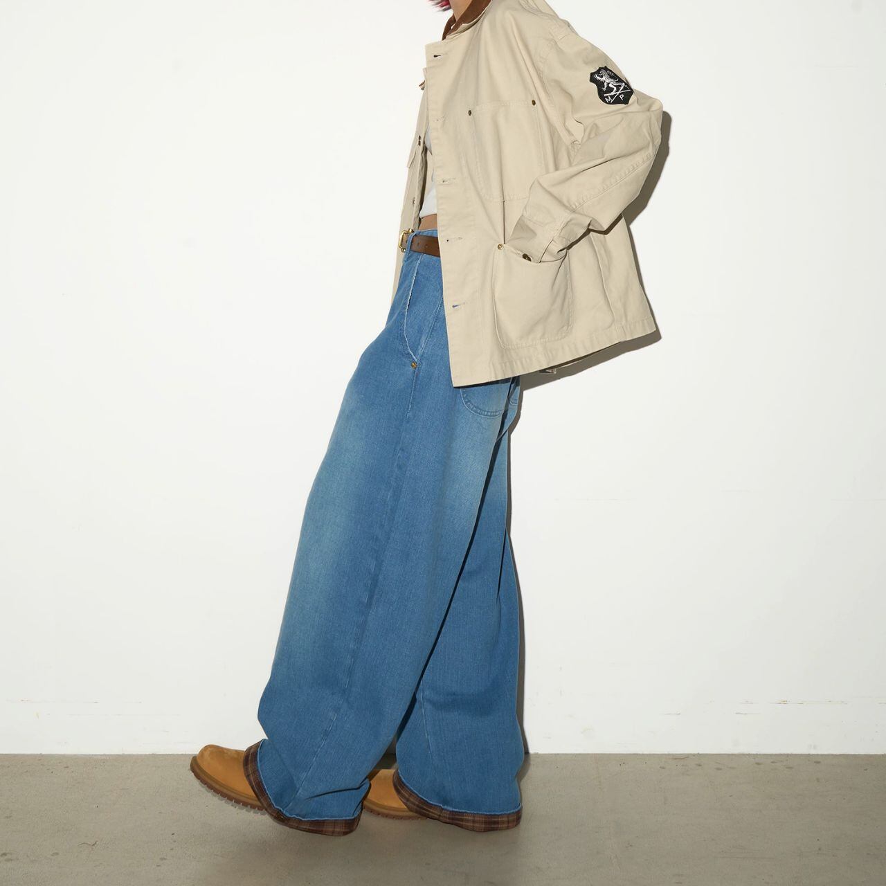 裾から覗くチェック柄がアクセントになったワイドシルエットのデニムパンツ。