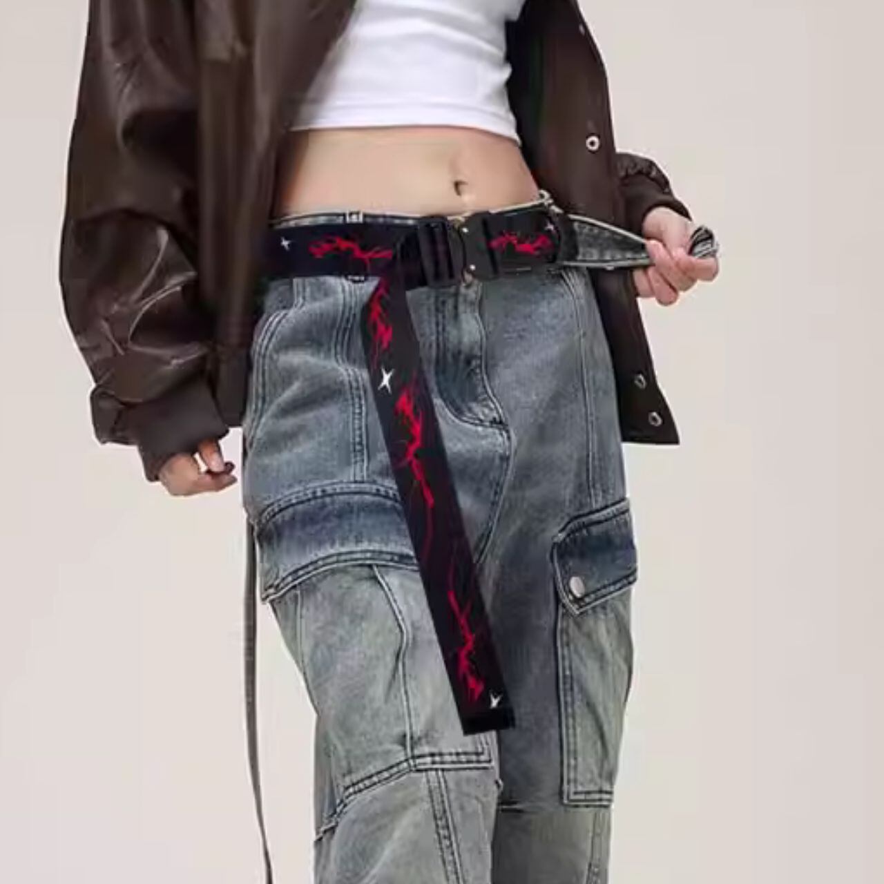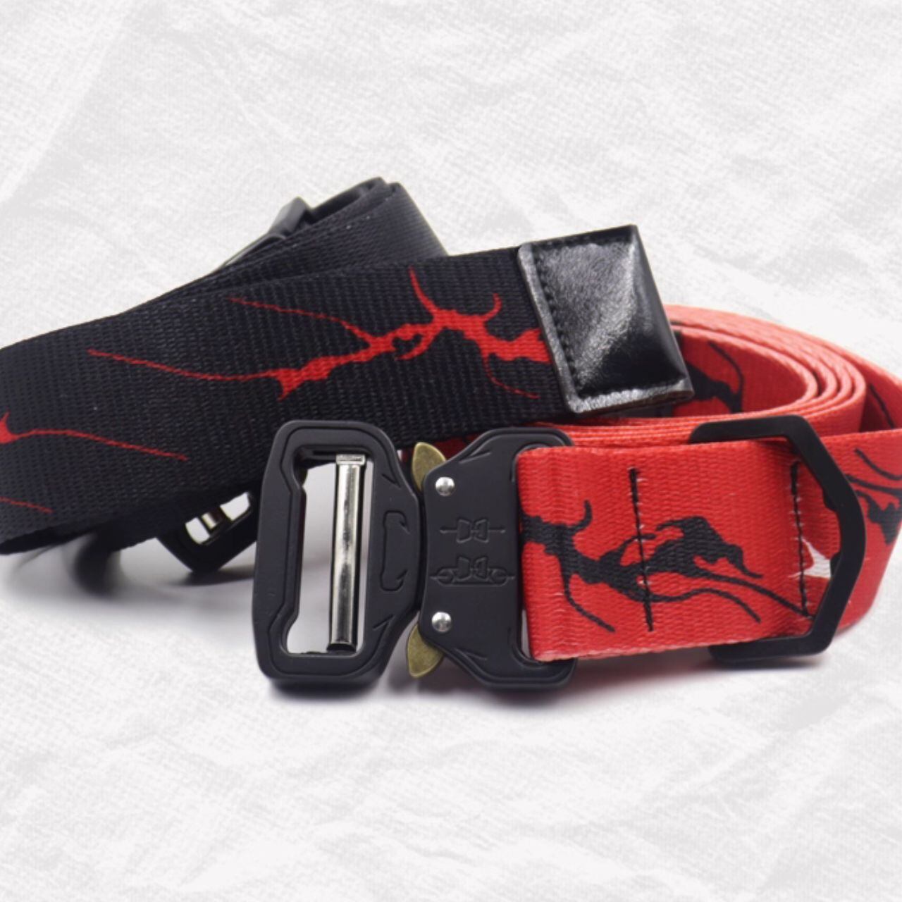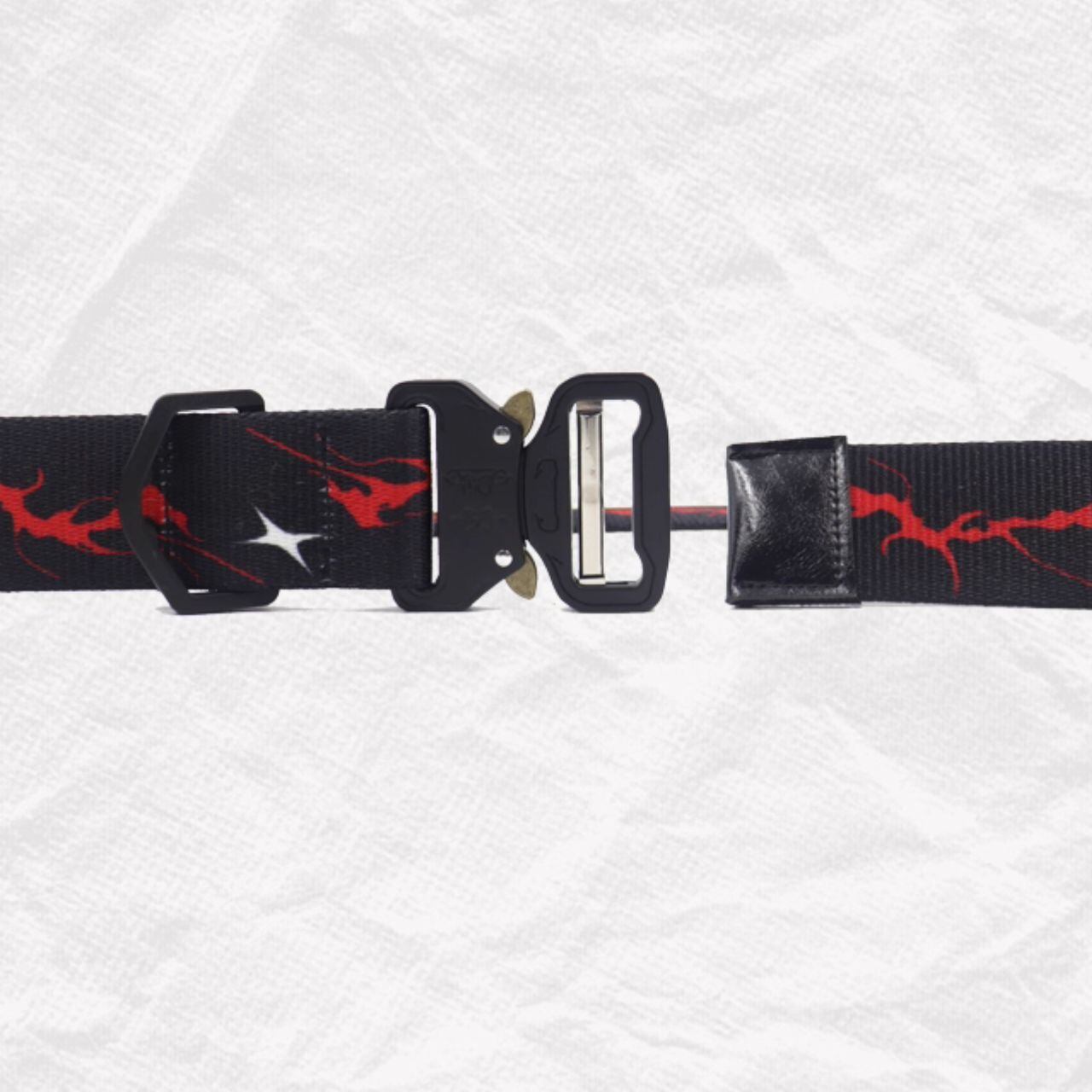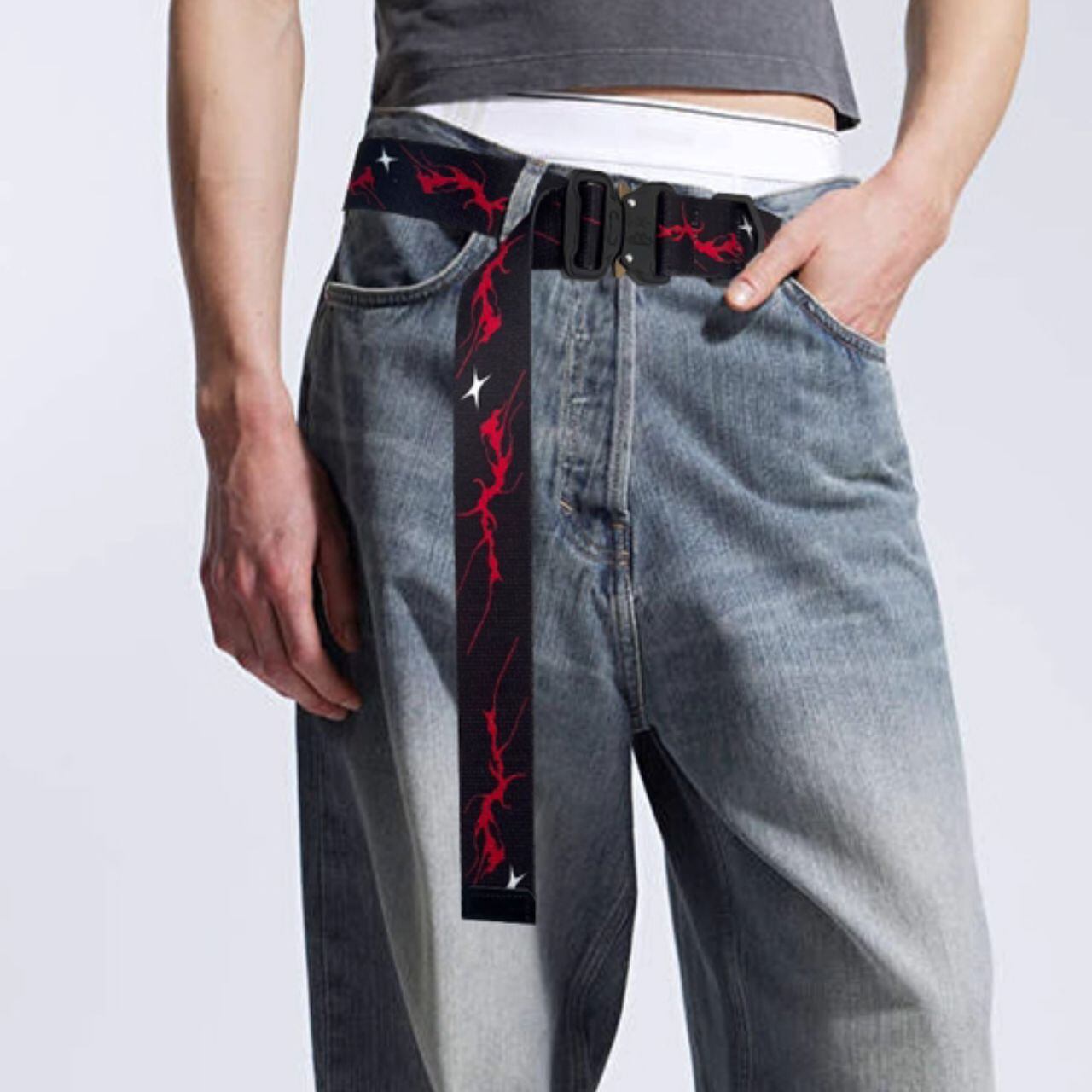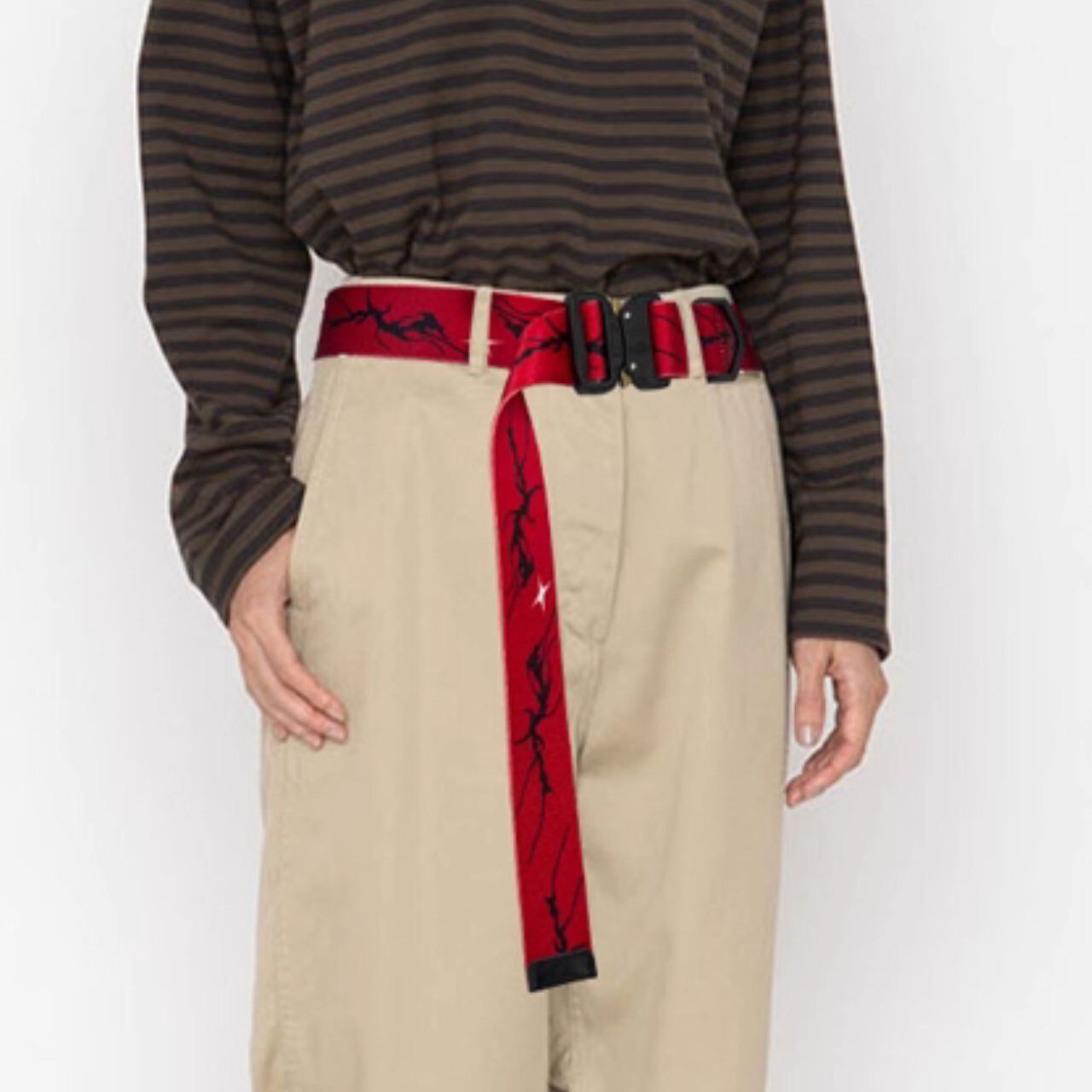 コーデのアクセントにぴったりなレッドとブラックのグラフィックベルト。